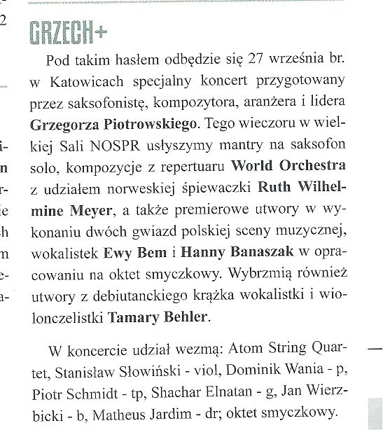 We wrześniowym numerze Jazz Forum pojawiła się informacja o koncercie Grzech +.